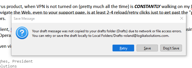 Feels like no antivirus vendor tests with email clients anymore. I’ve had most every one. Norton, Macafee, Bitdefender, Avg, Avast and a few I can’t remember right now. Same shit, different logo. Most of these companies believe they can make up for sub-par software by providing identity theft services. For some customers, maybe.