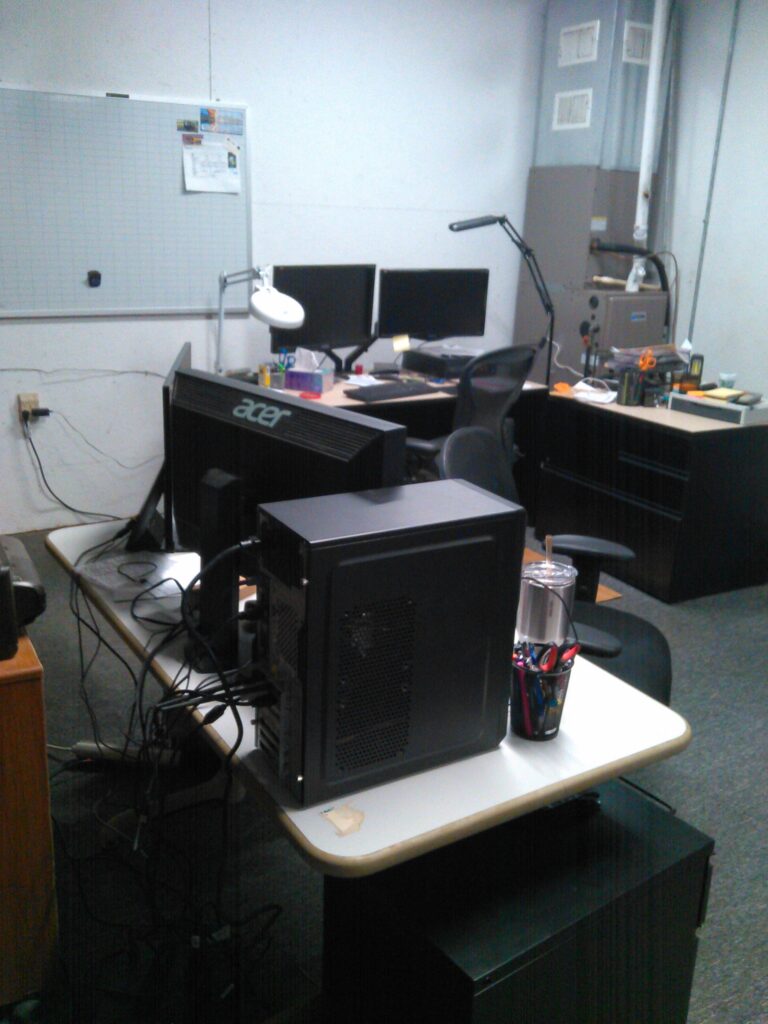 I set up an old Steelcase table that I bought used forever-ago in the middle of things to do some Copperspice development. I didn’t want to work in a VM on my main machine or risk some cross contamination because CopperSpice is a fork of Qt 4.8. Since I got rid of the Mahogany Monster I’ve had a lot more freedom to re-arrange to create “project stations.” I’m even thinking about adding one more full time desk over by the bench. Yeah, the Mahogany Monster was huge. If you want it contact American Business Interiors in Aurora, IL. If they haven’t already sold it to someone I’m sure they will sell it to you.