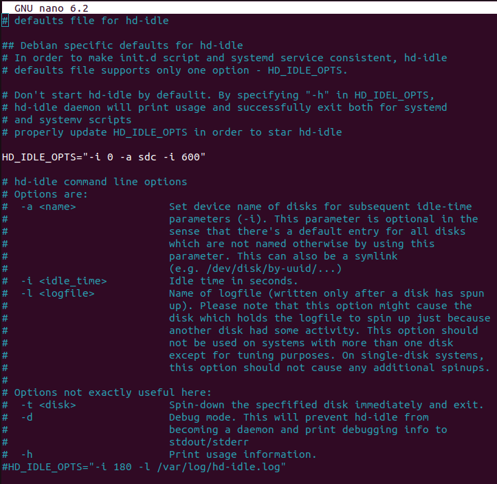 By default the line in white has “-h” so this doesn’t run. My external drive is sdc. If you think you want all of your external drives to sleep after 10 minutes simply use “-i 600.”